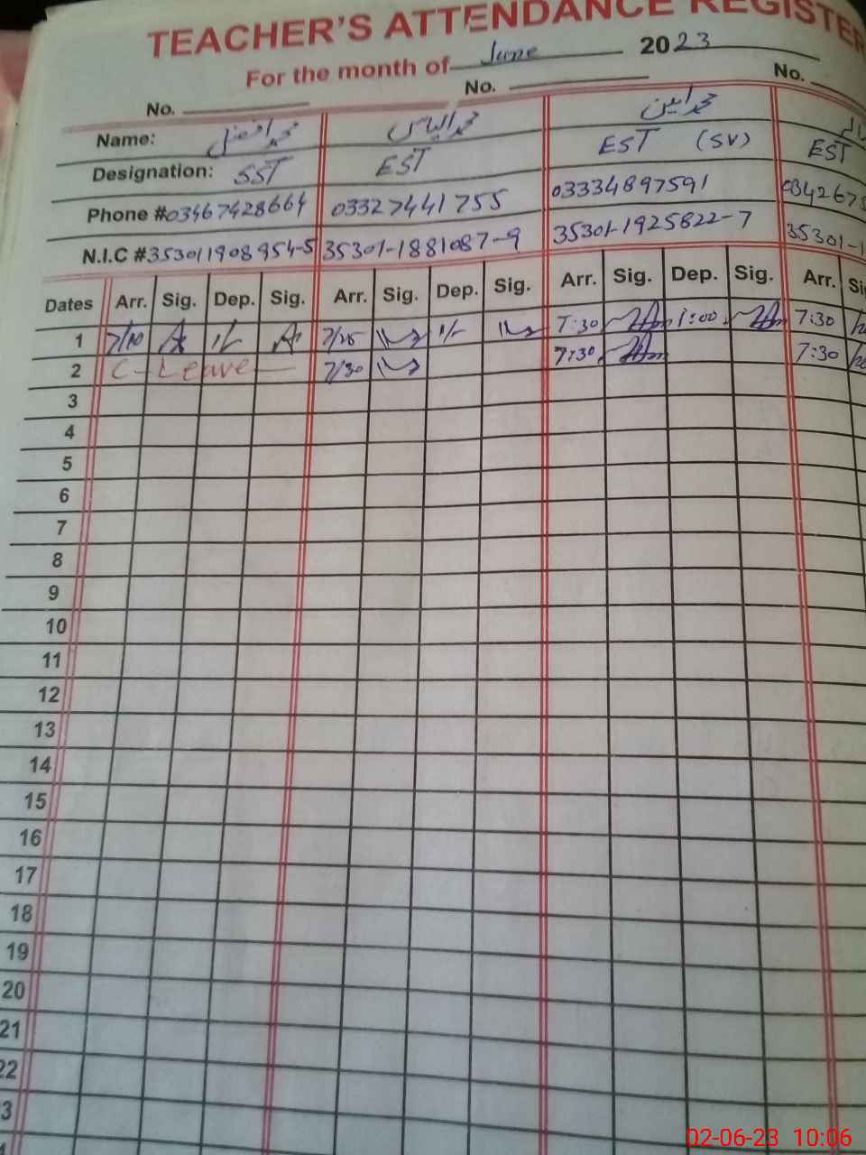| CNIC | Full Name | Designation | R/C | Absence during last cal. month |