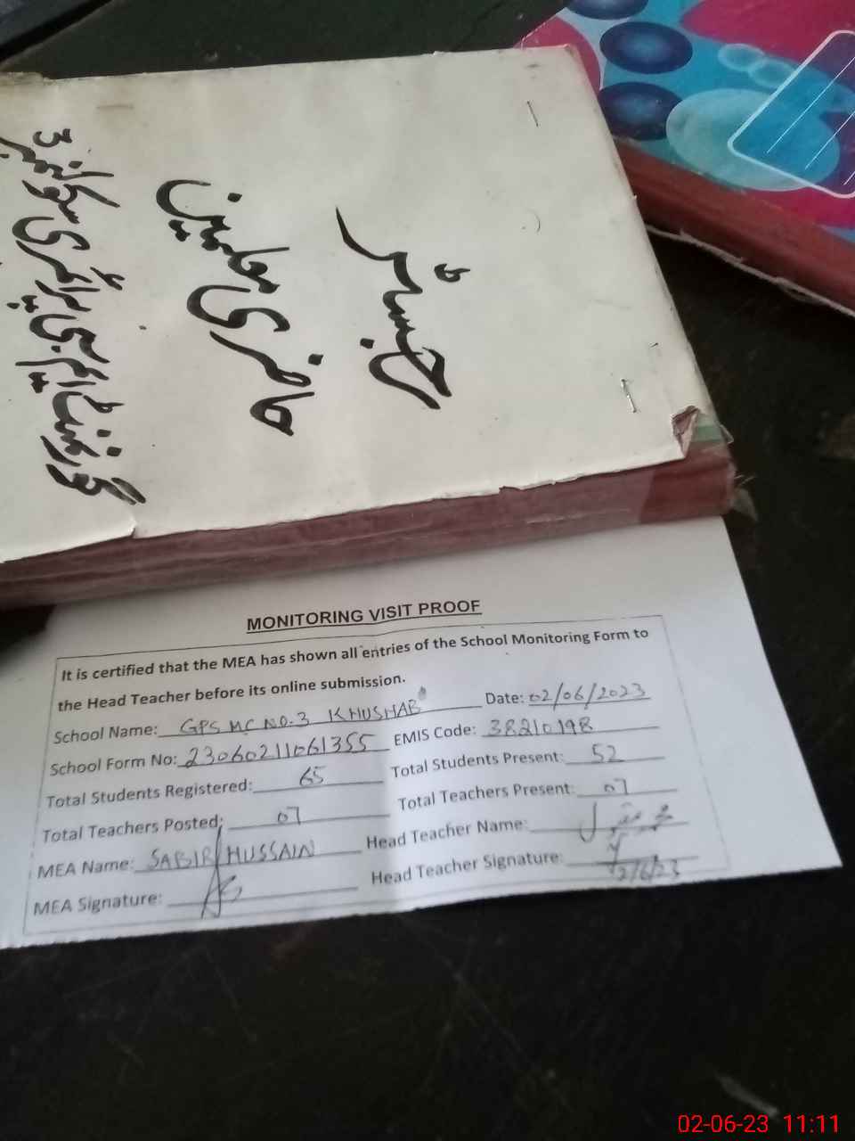 | EMIS Code: 38210198 | Name of School: GPS MC NO. 3 KHUSHAB MOHALLAH HAKIMAN WALA | |||