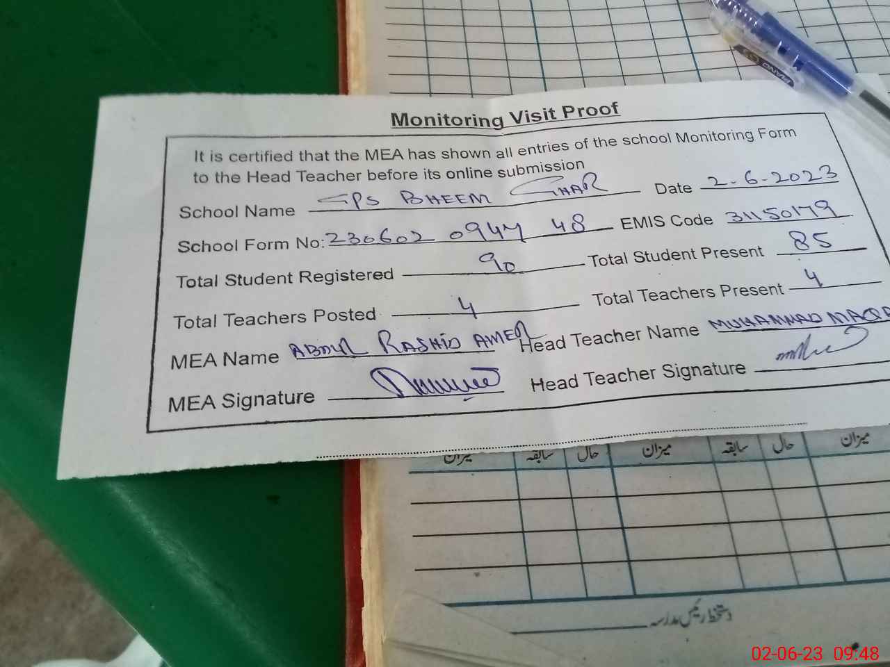 | Attendance Register | Head Teacher | MEA with School | Visit Proof |