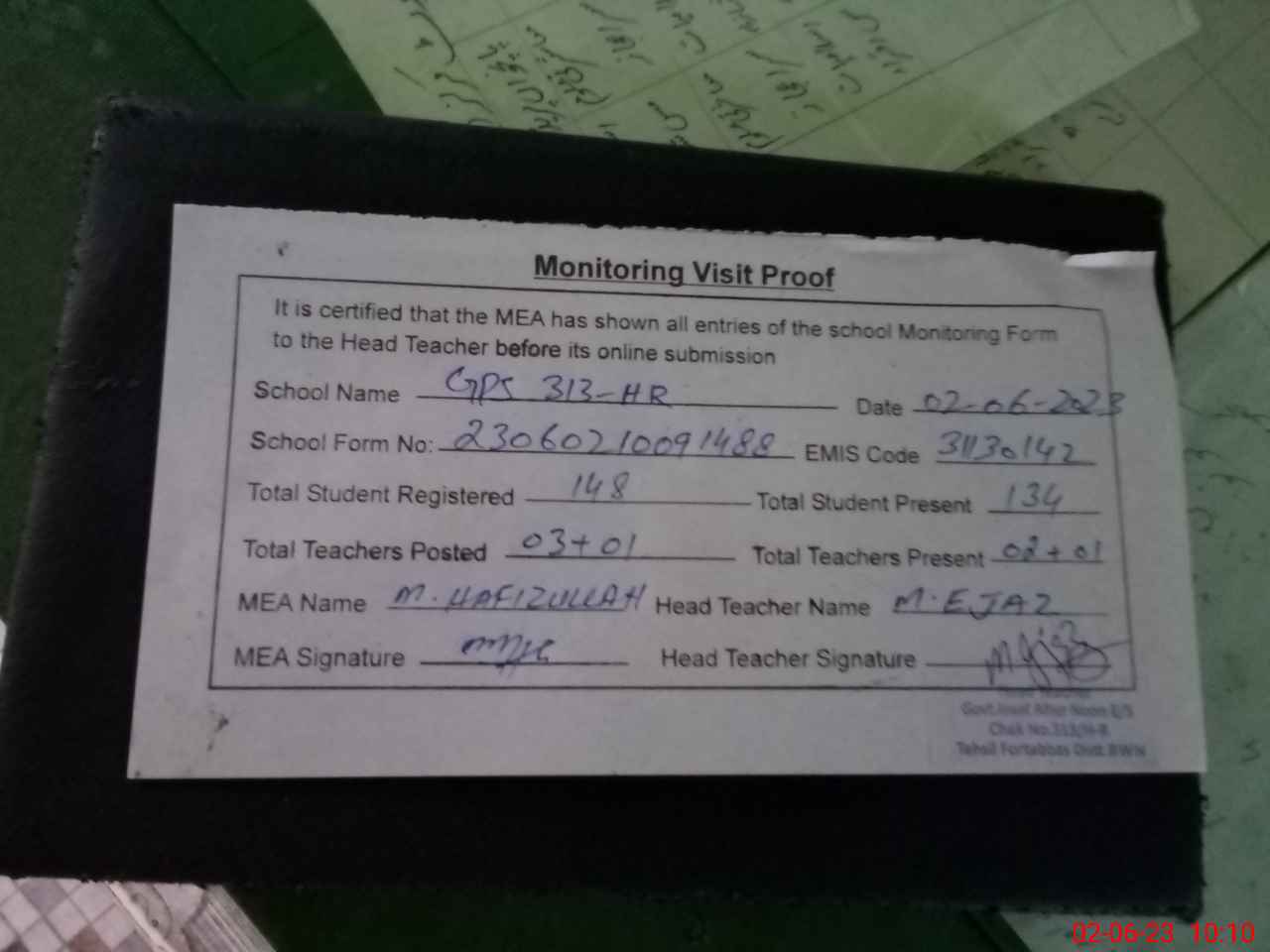 | Attendance Register | Head Teacher | MEA with School | Visit Proof |