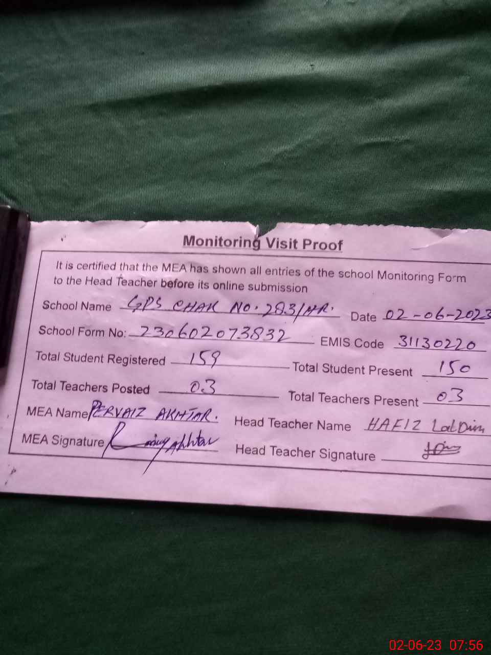 | Attendance Register | Head Teacher | MEA with School | Visit Proof |