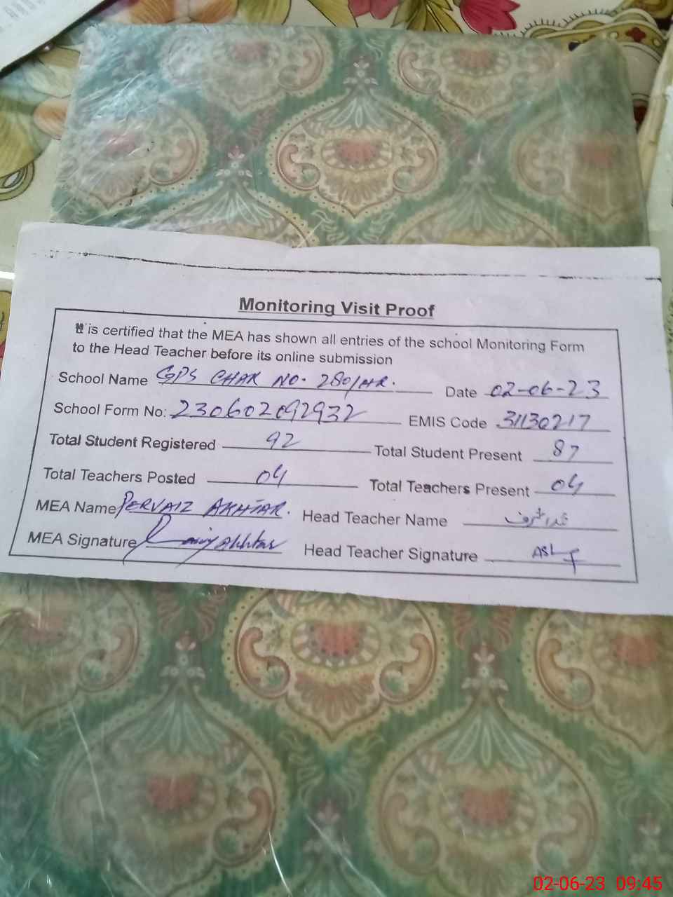 | Attendance Register | Head Teacher | MEA with School | Visit Proof |