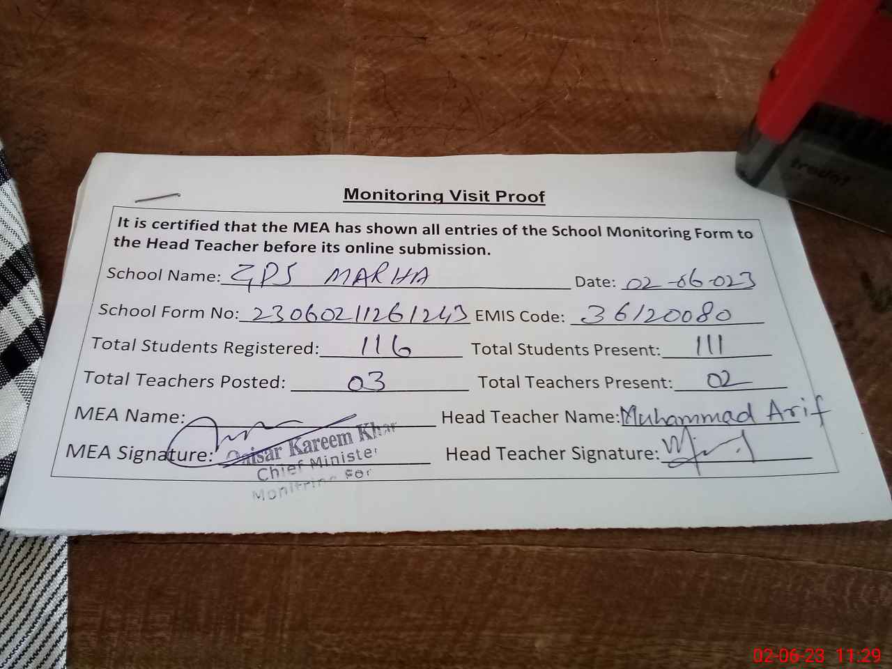 | Attendance Register | Head Teacher | MEA with School | Visit Proof |