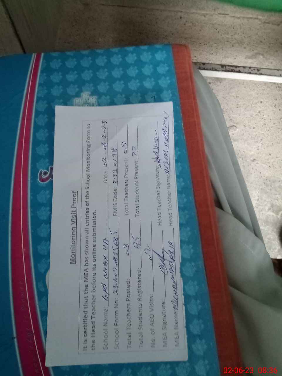 | Attendance Register | Head Teacher | MEA with School | Visit Proof |