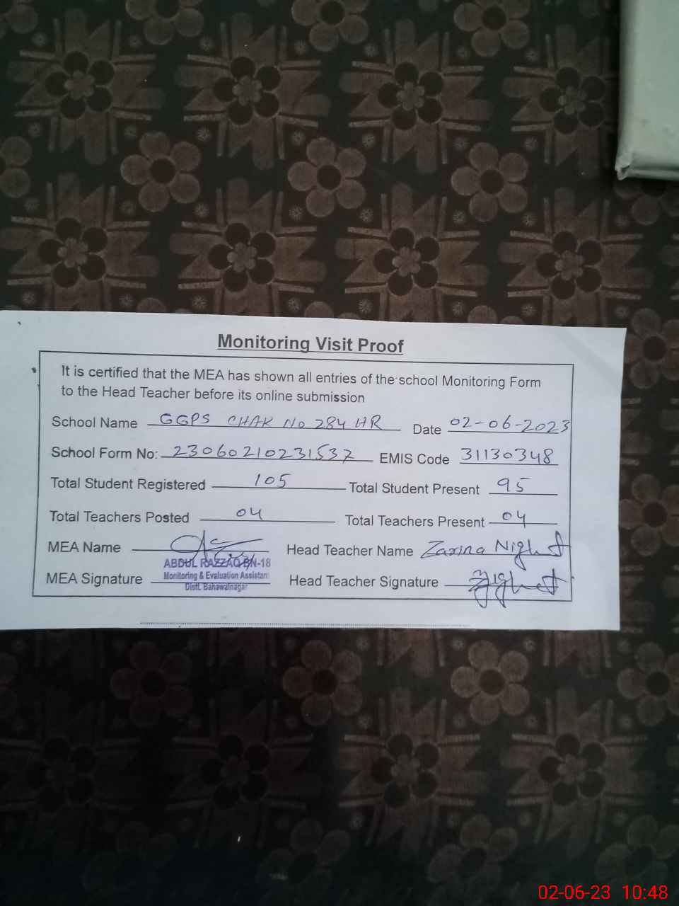 | Attendance Register | Head Teacher | MEA with School | Visit Proof |
