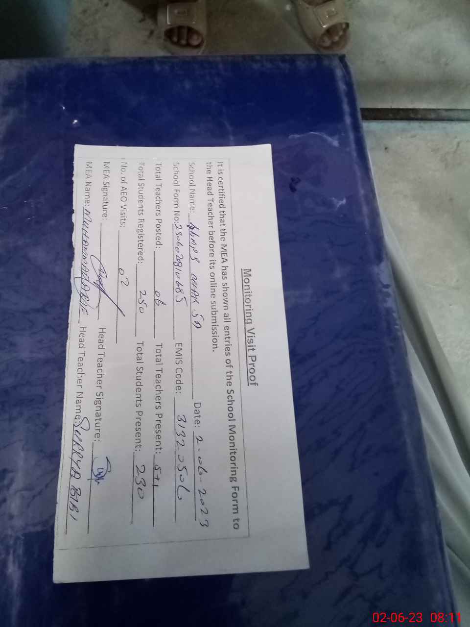 | Attendance Register | Head Teacher | MEA with School | Visit Proof |