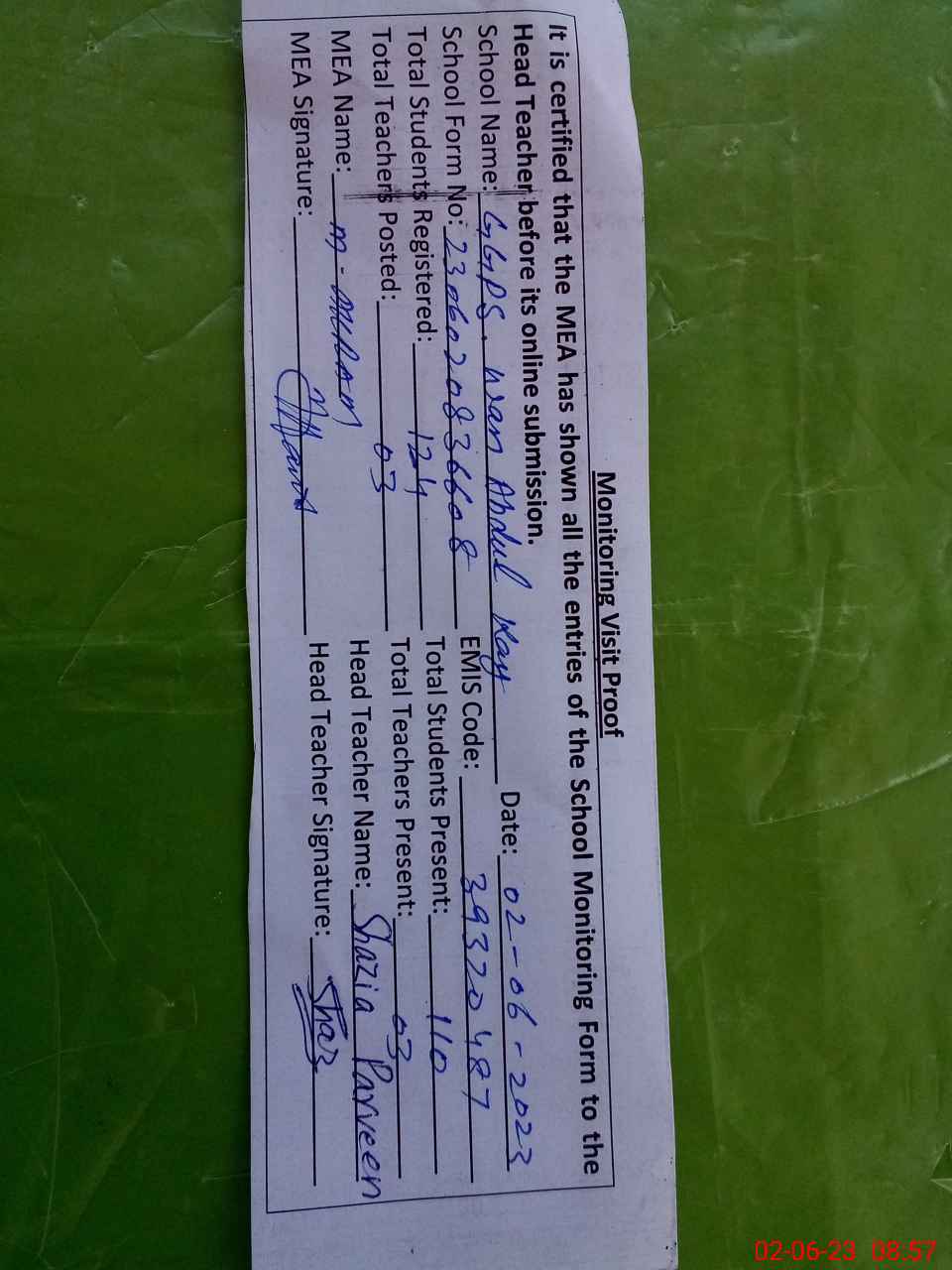 | Attendance Register | Head Teacher | MEA with School | Visit Proof |