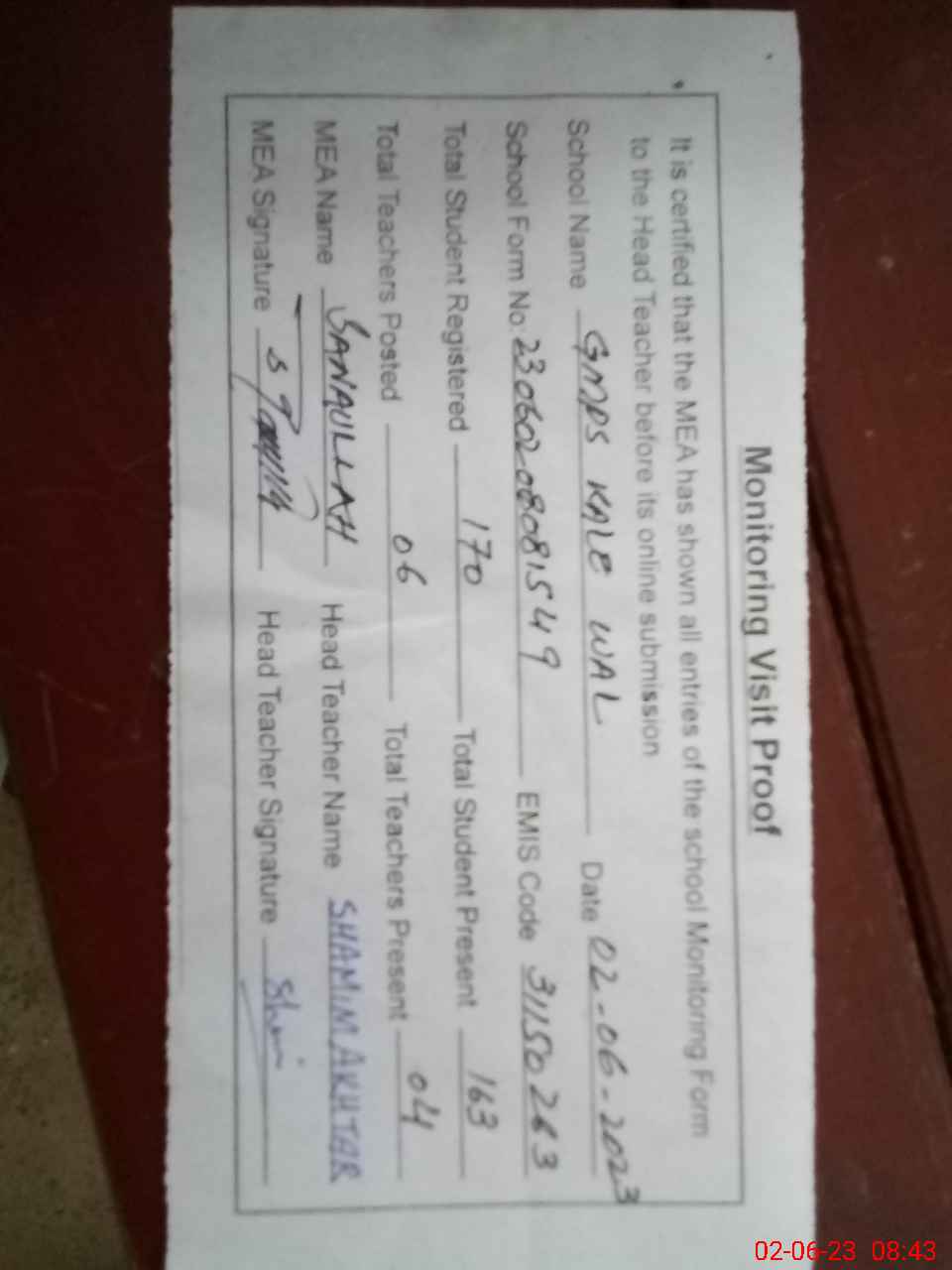 | Attendance Register | Head Teacher | MEA with School | Visit Proof |