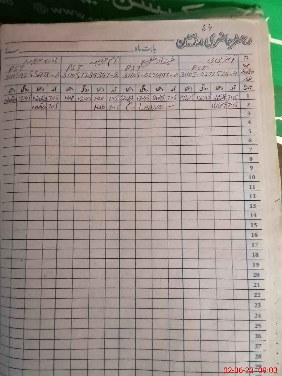 | CNIC | Full Name | Designation | R/C | Absence During Last Calender Month |