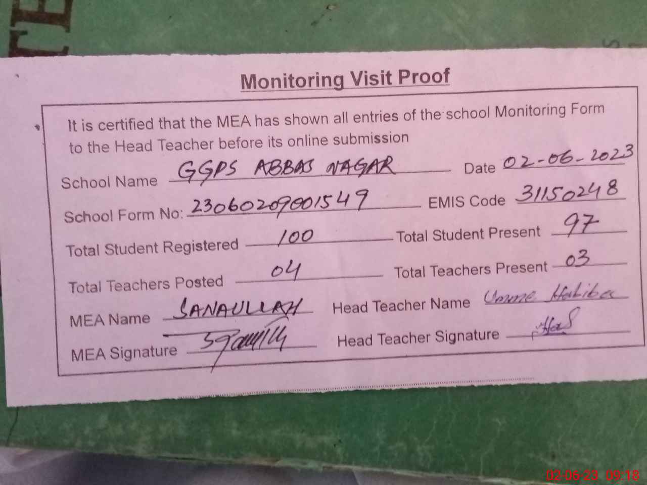 | Attendance Register | Head Teacher | MEA with School | Visit Proof |