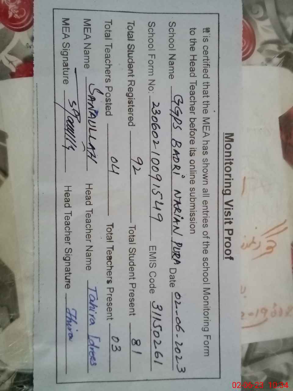 | Attendance Register | Head Teacher | MEA with School | Visit Proof |