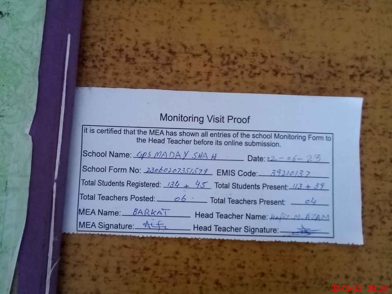 | Attendance Register | Head Teacher | MEA with School | Visit Proof |
