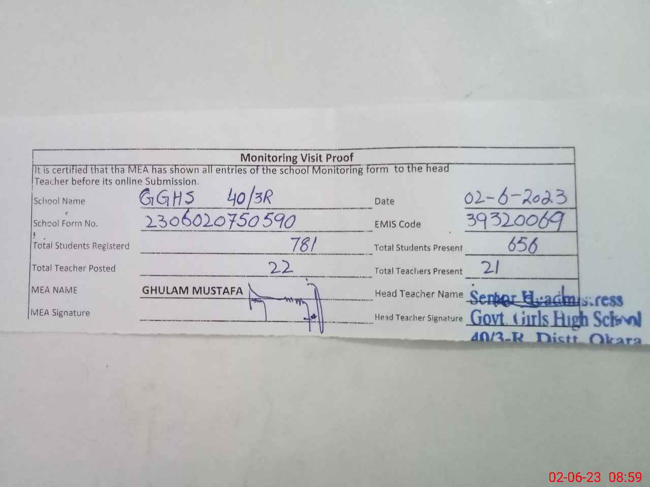 | Attendance Register | Head Teacher | MEA with School | Visit Proof |