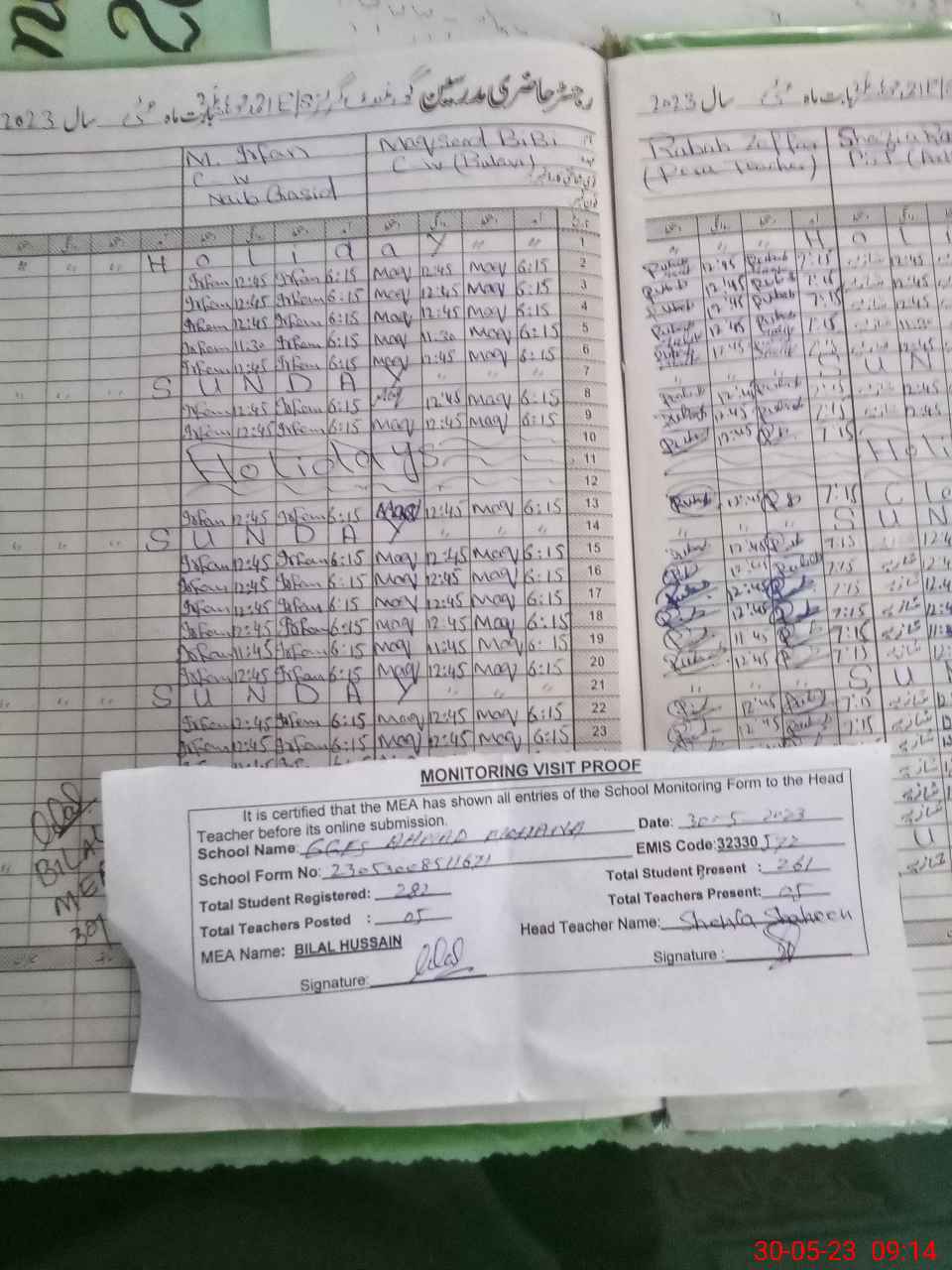 | Attendance Register | Head Teacher | MEA with School | Visit Proof |
