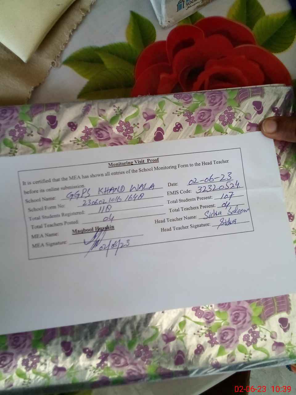 | Attendance Register | Head Teacher | MEA with School | Visit Proof |