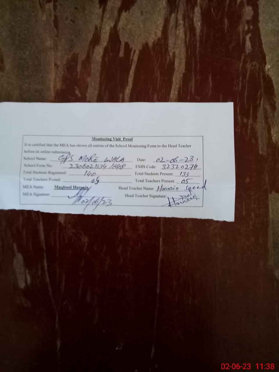 | Attendance Register | Head Teacher | MEA with School | Visit Proof |