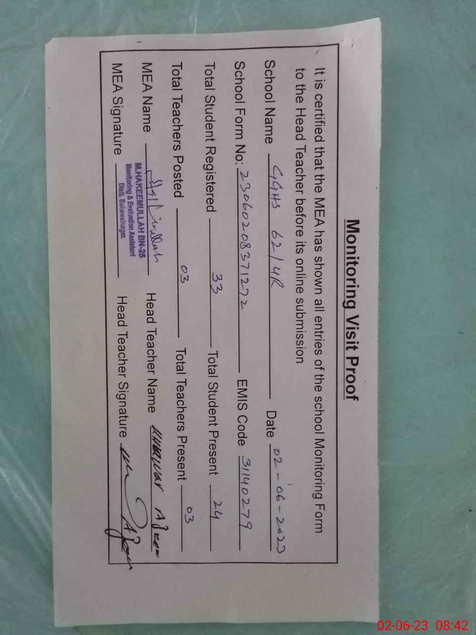 | Attendance Register | Head Teacher | MEA with School | Visit Proof |
