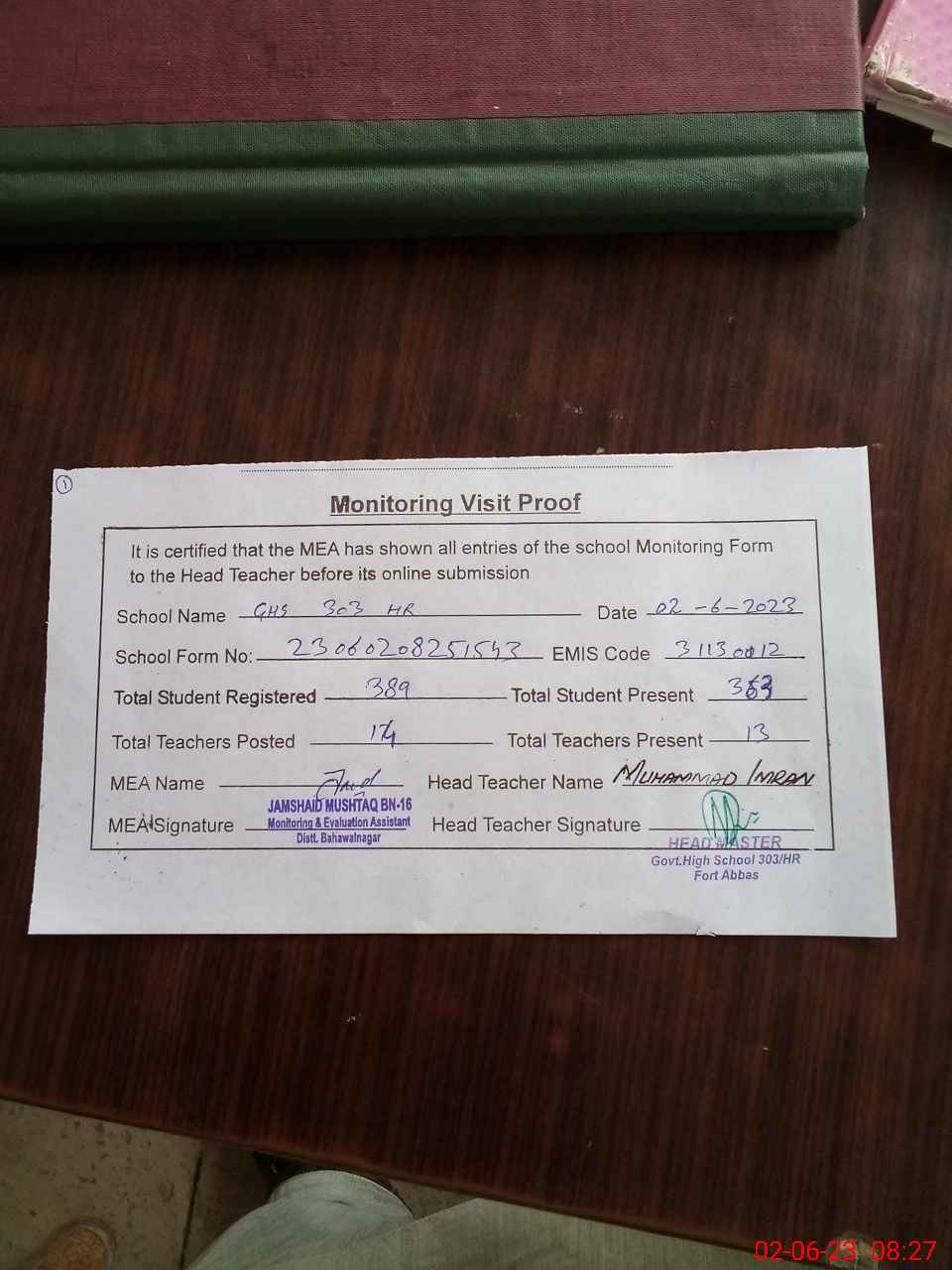 | Attendance Register | Head Teacher | MEA with School | Visit Proof |