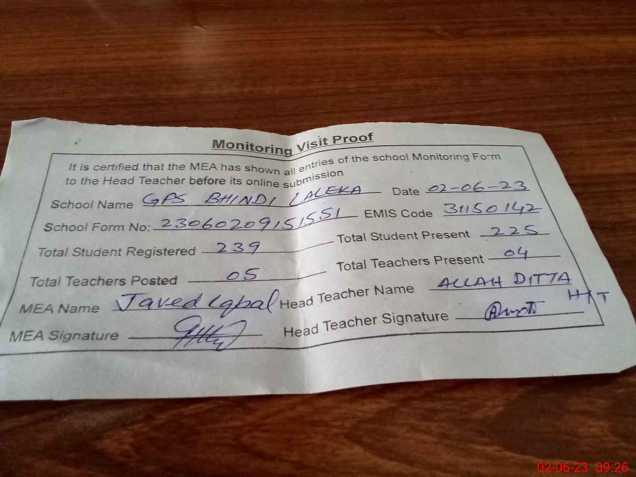 | Attendance Register | Head Teacher | MEA with School | Visit Proof |
