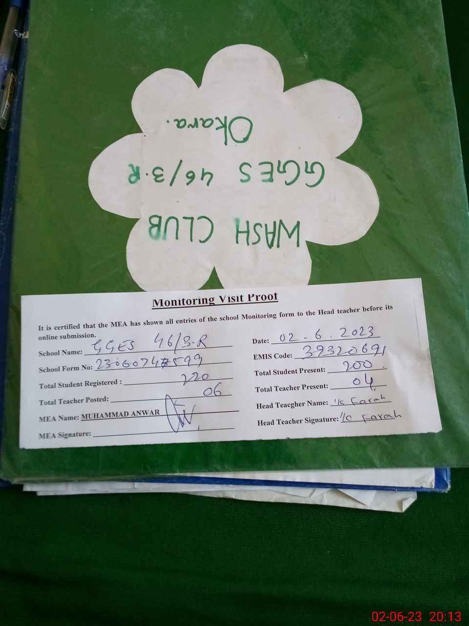 | Attendance Register | Head Teacher | MEA with School | Visit Proof |