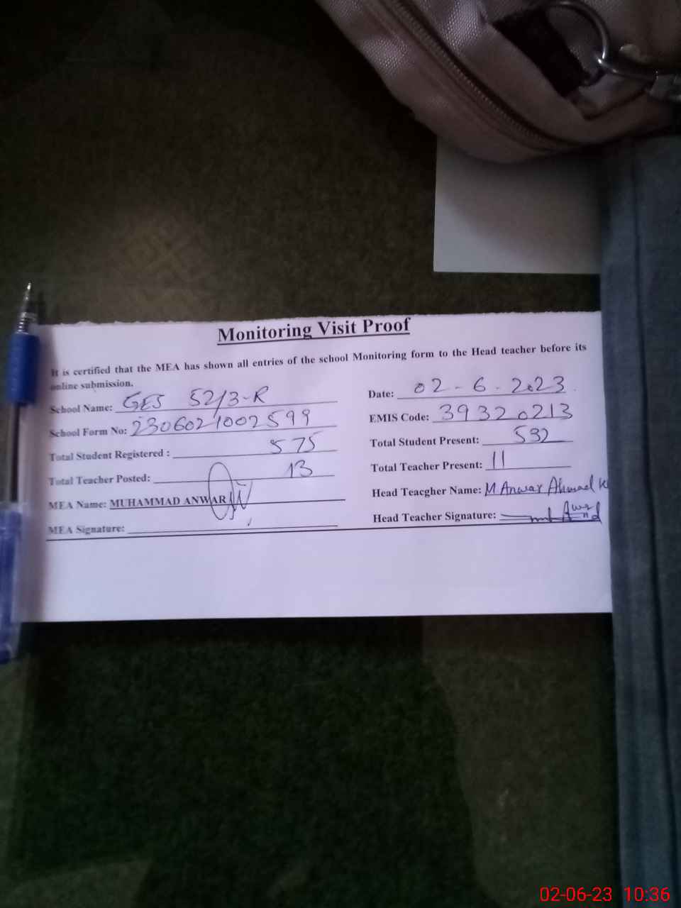 | Attendance Register | Head Teacher | MEA with School | Visit Proof |