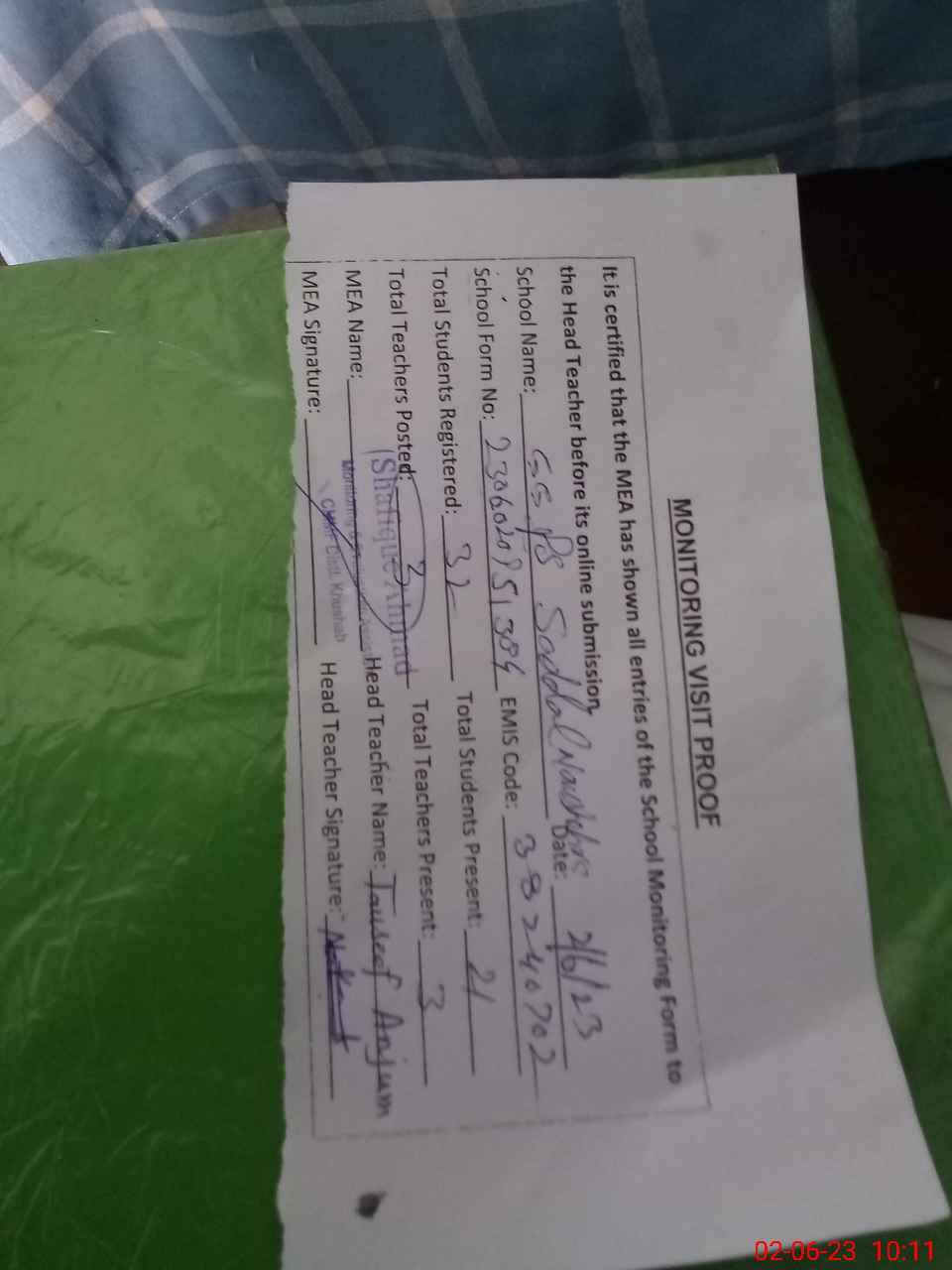 | Attendance Register | Head Teacher | MEA with School | Visit Proof |
