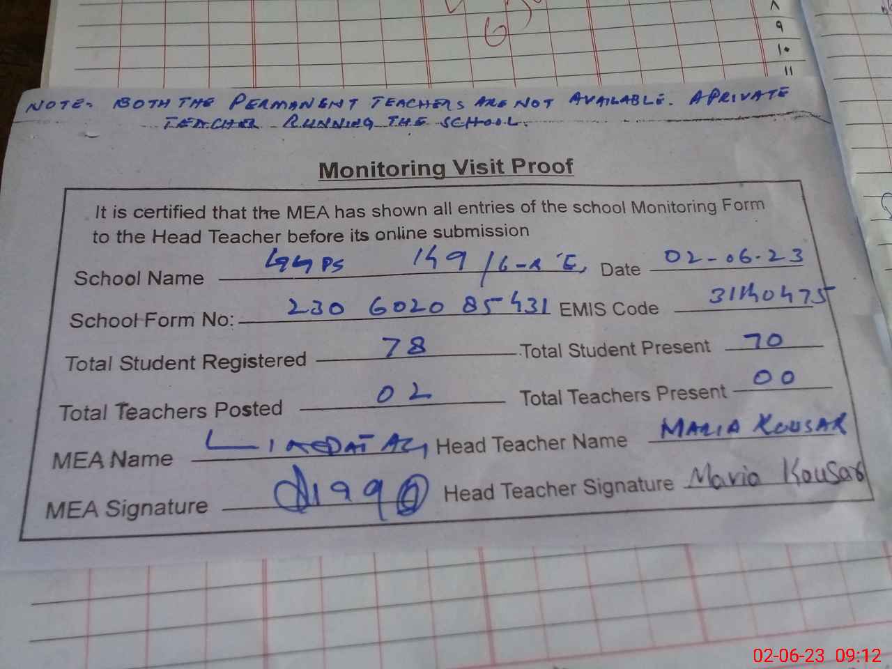| Attendance Register | Head Teacher | MEA with School | Visit Proof |
