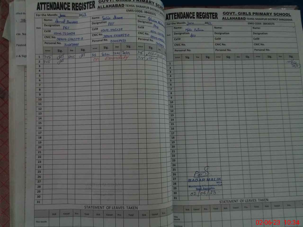| Name: AK**** PA**** Designation: (School Headmaster's/Headmistress's) PST Phone/Cell Number: 03**** |