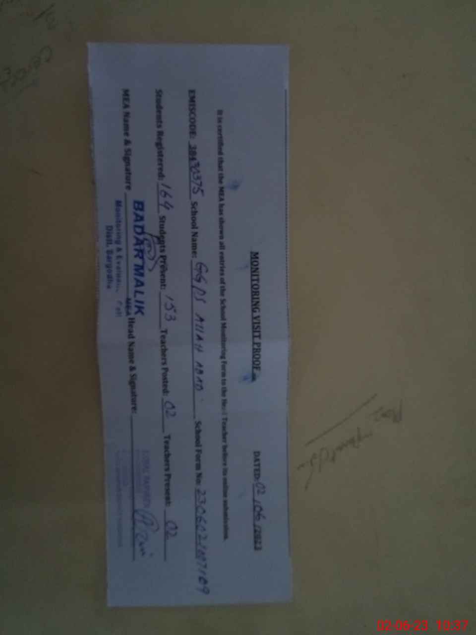 | Certified that this School was Inspected by the Undersigned MEA/DMO Today and the Information Stated Above is as Per Record. | |||||