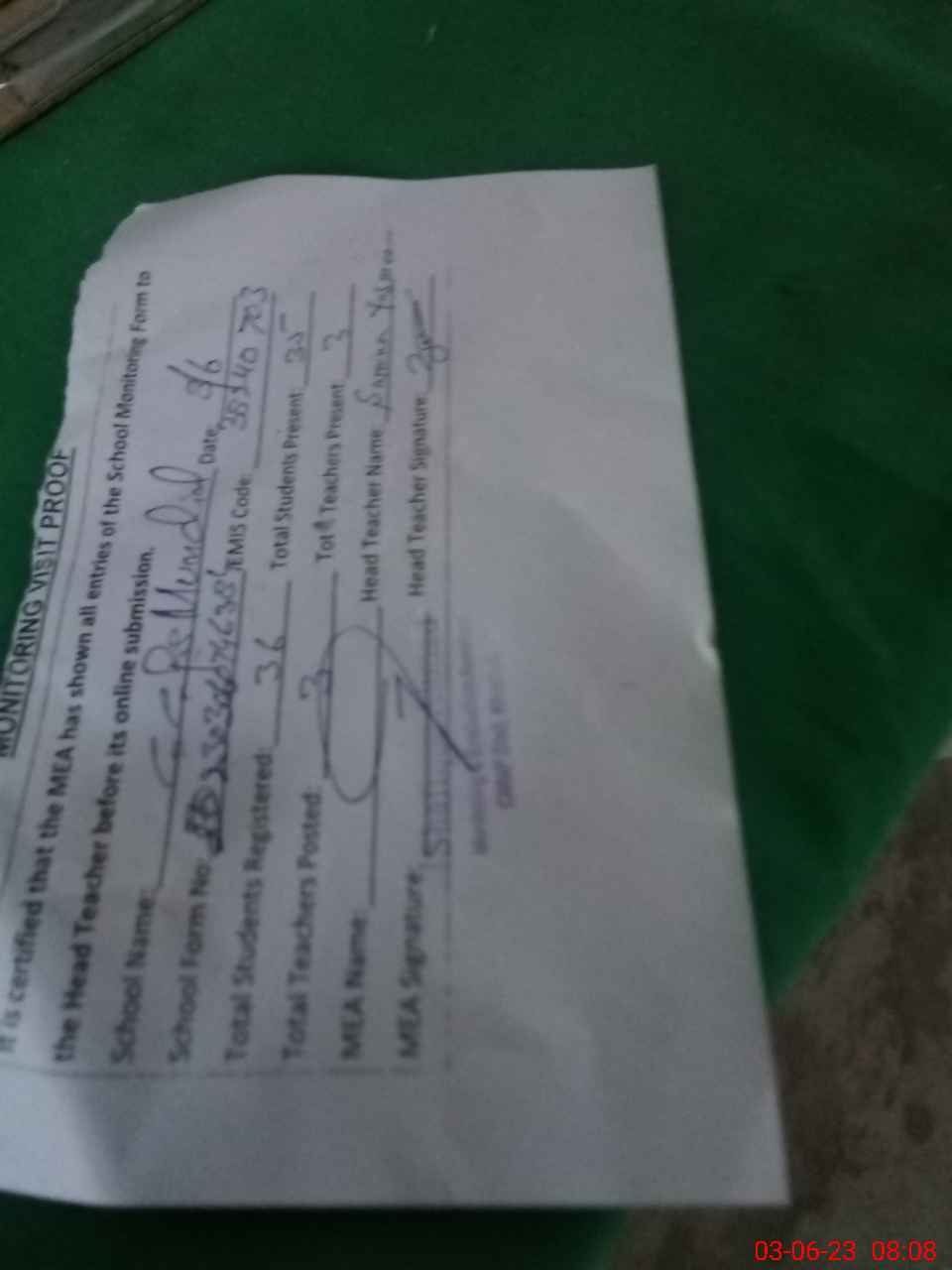 | Attendance Register | Head Teacher | MEA with School | Visit Proof |