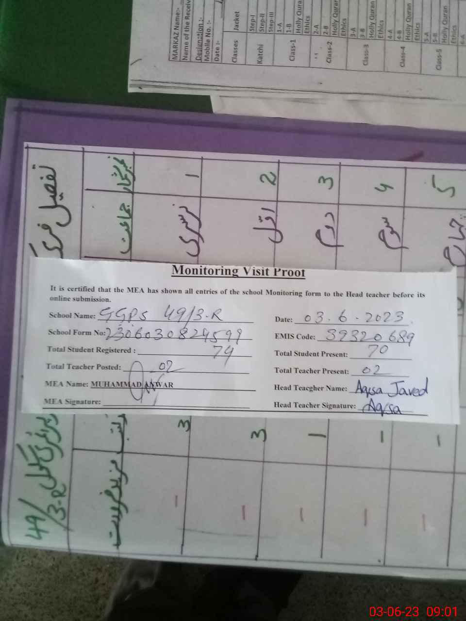 | Attendance Register | Head Teacher | MEA with School | Visit Proof |