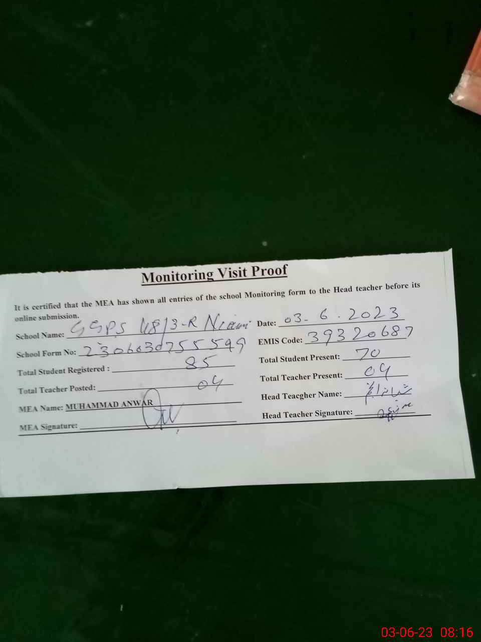 | Attendance Register | Head Teacher | MEA with School | Visit Proof |