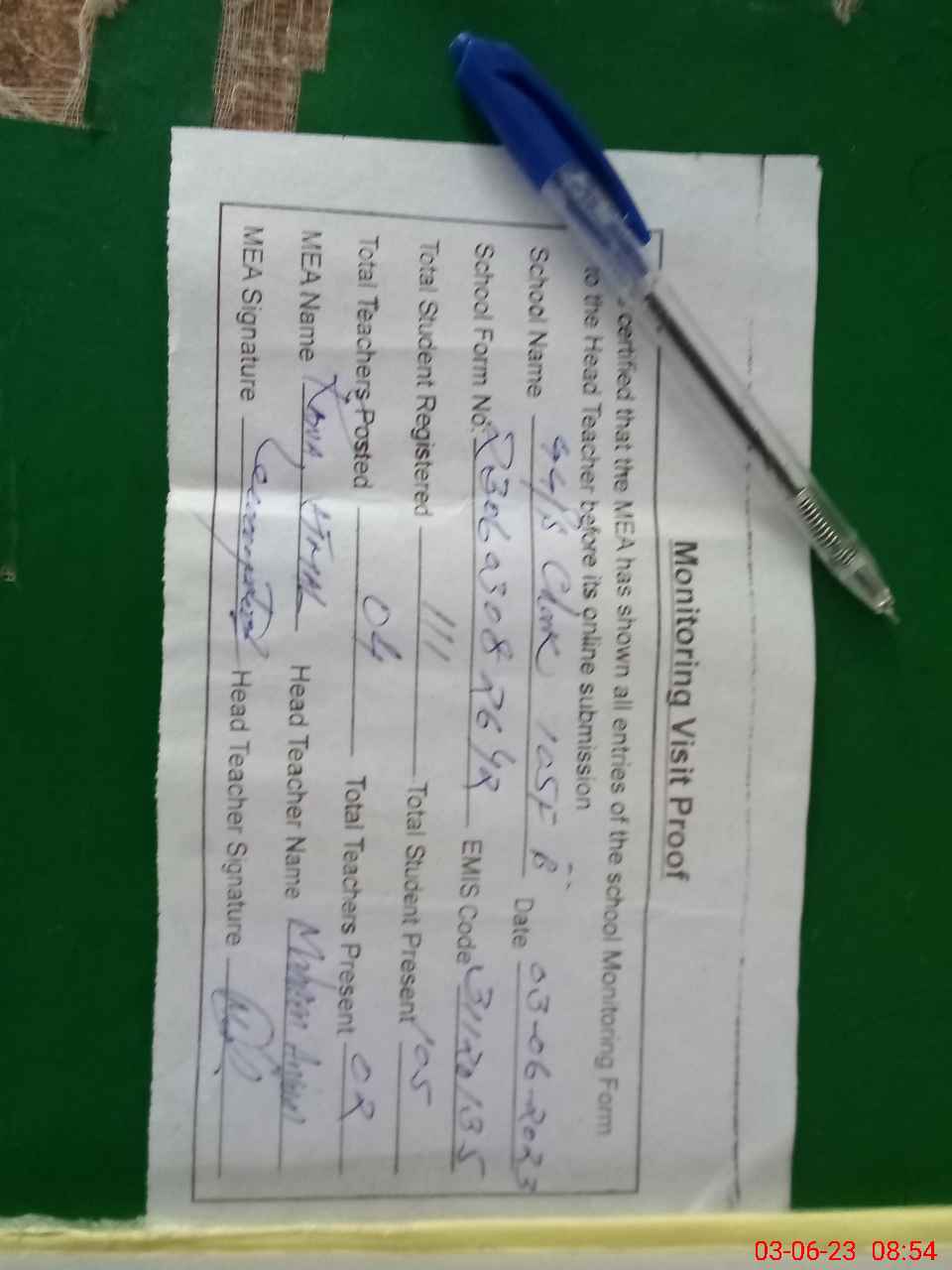 | Attendance Register | Head Teacher | MEA with School | Visit Proof |