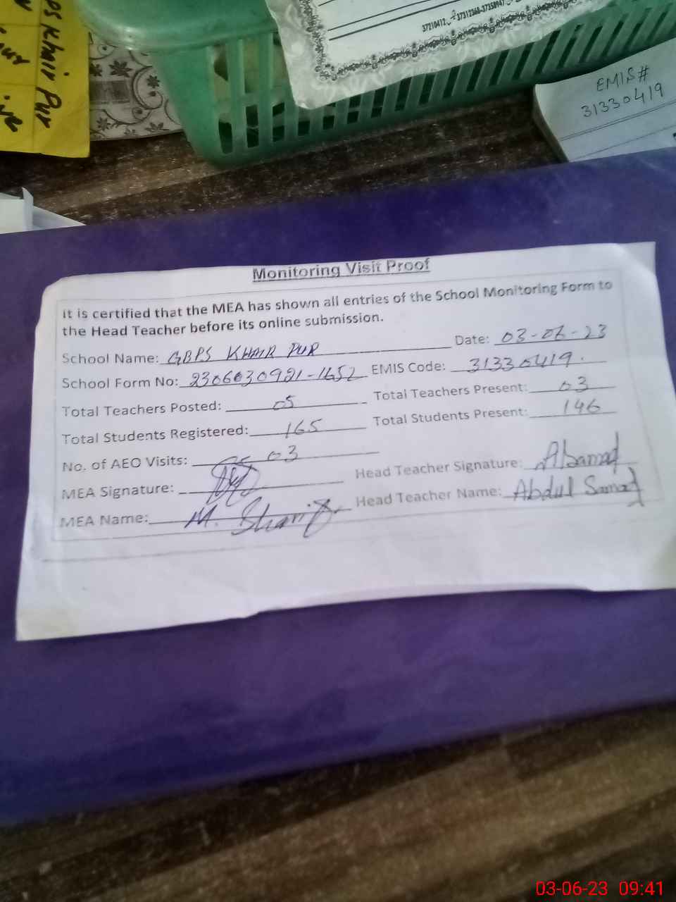 | Attendance Register | Head Teacher | MEA with School | Visit Proof |