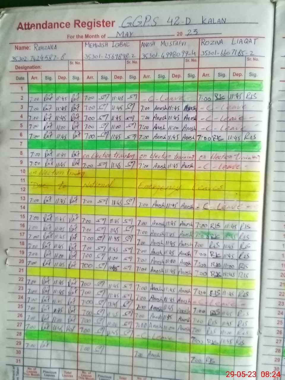 | CNIC | Full Name | Designation | R/C | Absence During Last Calender Month |
