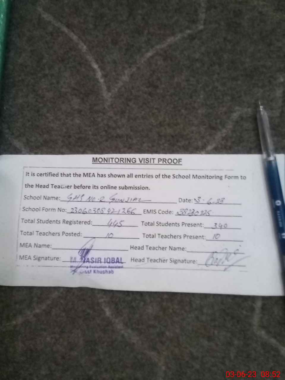 | Attendance Register | Head Teacher | MEA with School | Visit Proof |