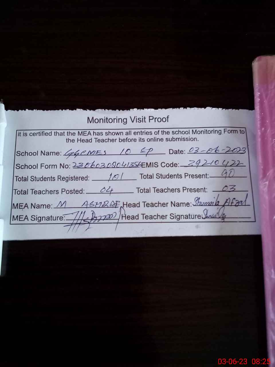 | Attendance Register | Head Teacher | MEA with School | Visit Proof |