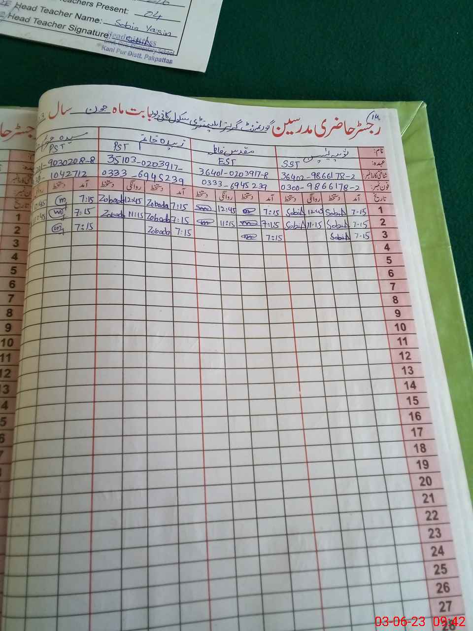 | Name: SO**** YA**** Designation: (School Headmaster's/Headmistress's) SST (SCIENCE) Phone/Cell Number: 03**** |