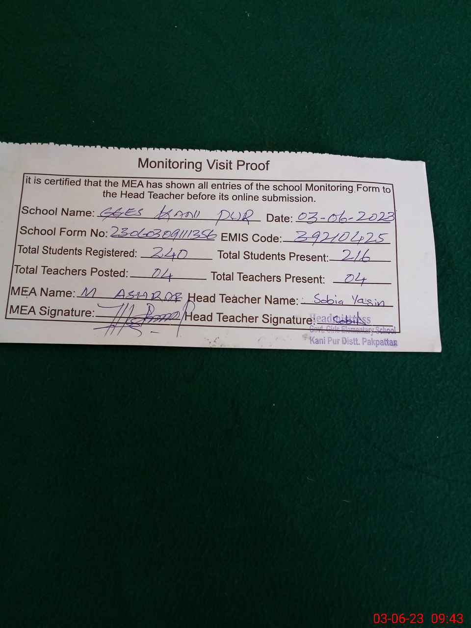 | Attendance Register | Head Teacher | MEA with School | Visit Proof |