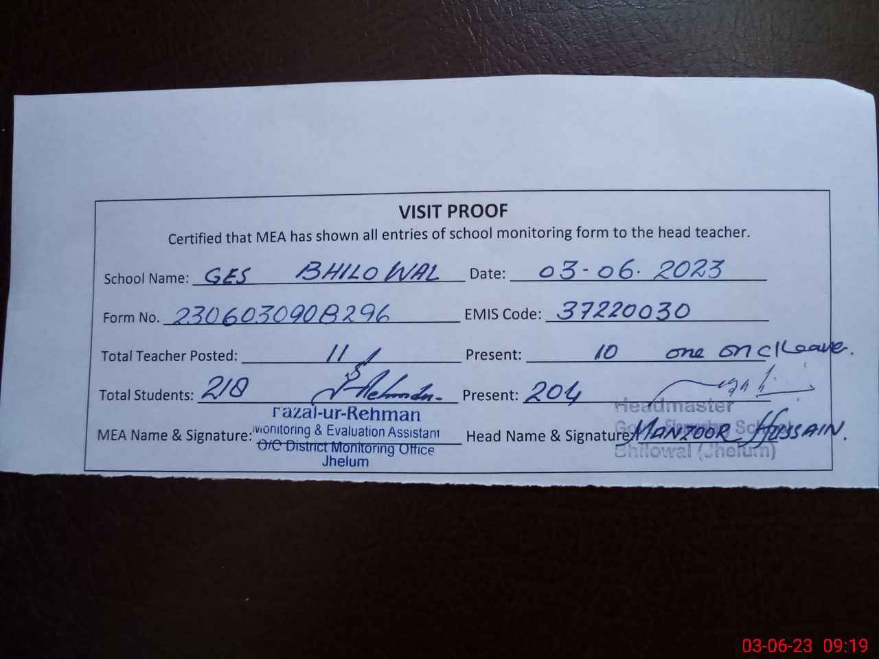| Attendance Register | Head Teacher | MEA with School | Visit Proof |