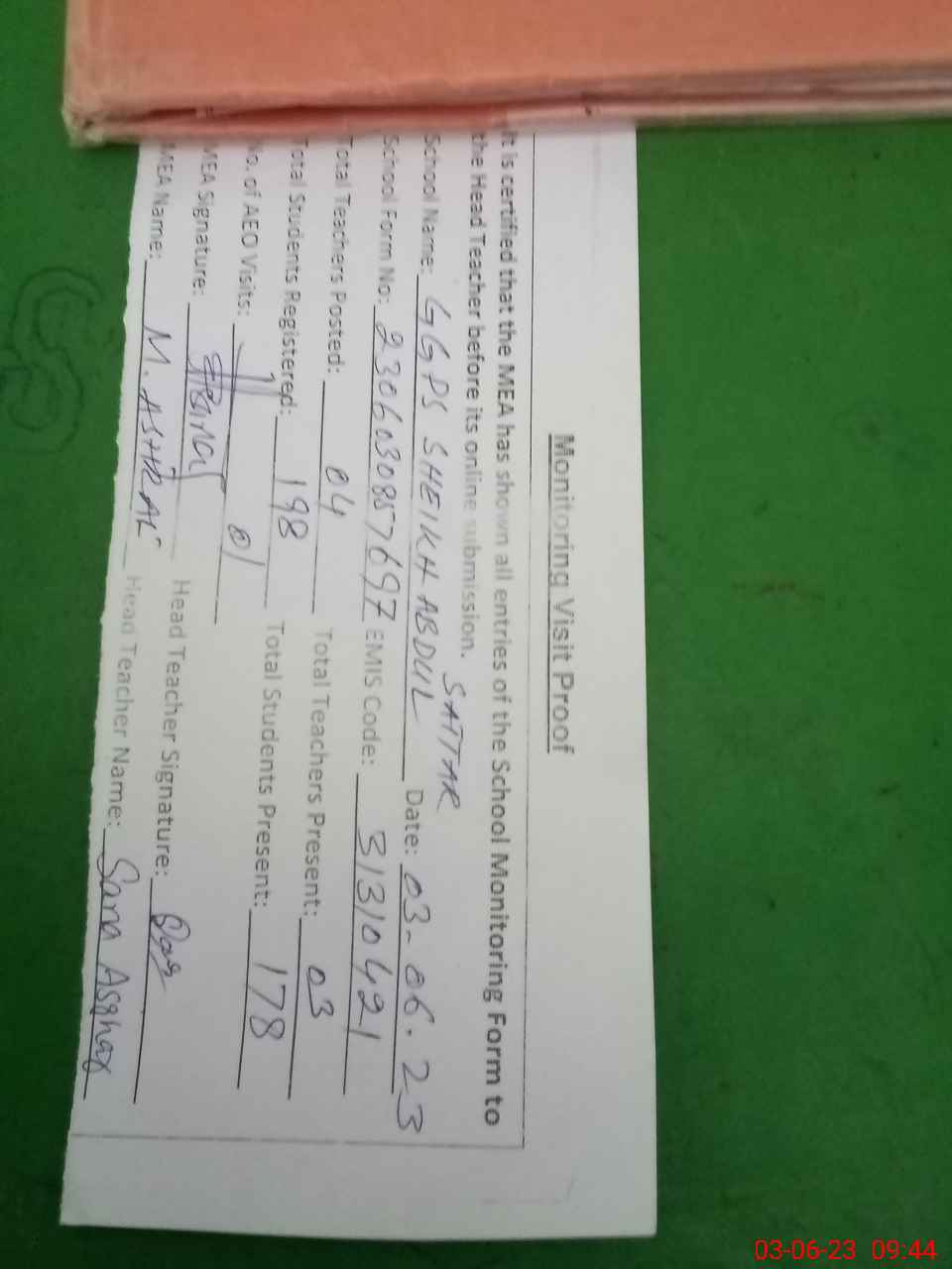 | Attendance Register | Head Teacher | MEA with School | Visit Proof |