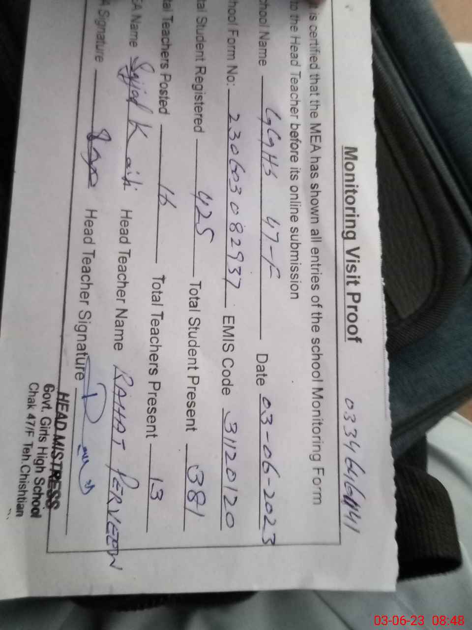 | EMIS Code: 31120120 | Name of School: GGHS CHAK NO. 47/F | |||