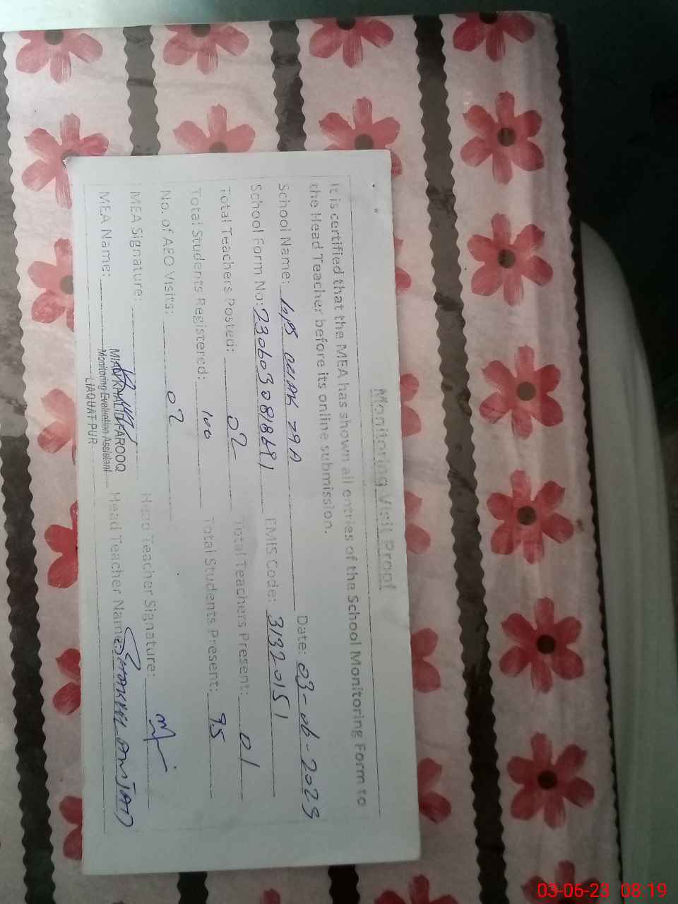| Certified that this School was Inspected by the Undersigned MEA/DMO Today and the Information Stated Above is as Per Record. | |||||