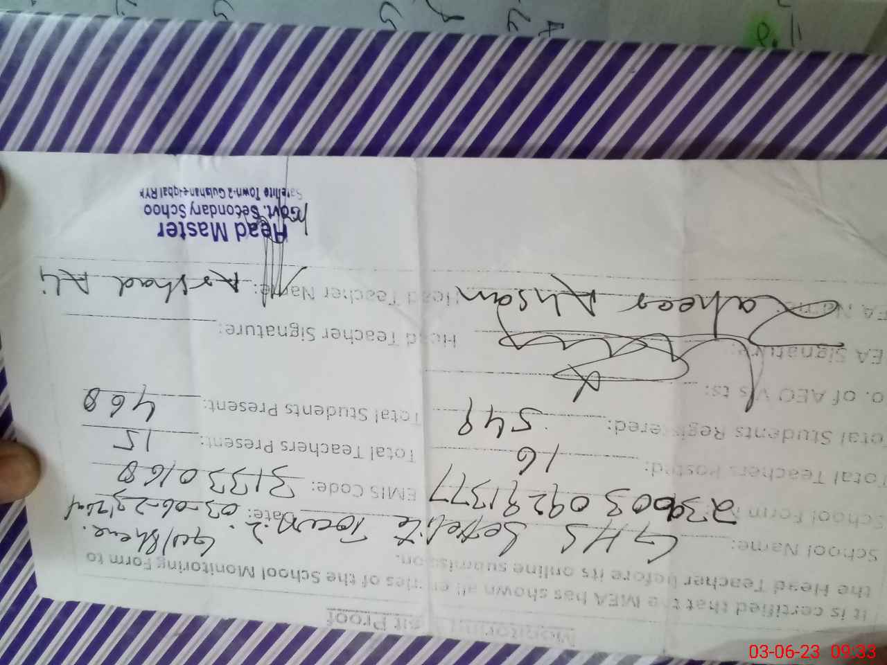 | Name: Ir**** Ah**** Designation: (School Headmaster's/Headmistress's) SST Phone/Cell Number: 03**** |