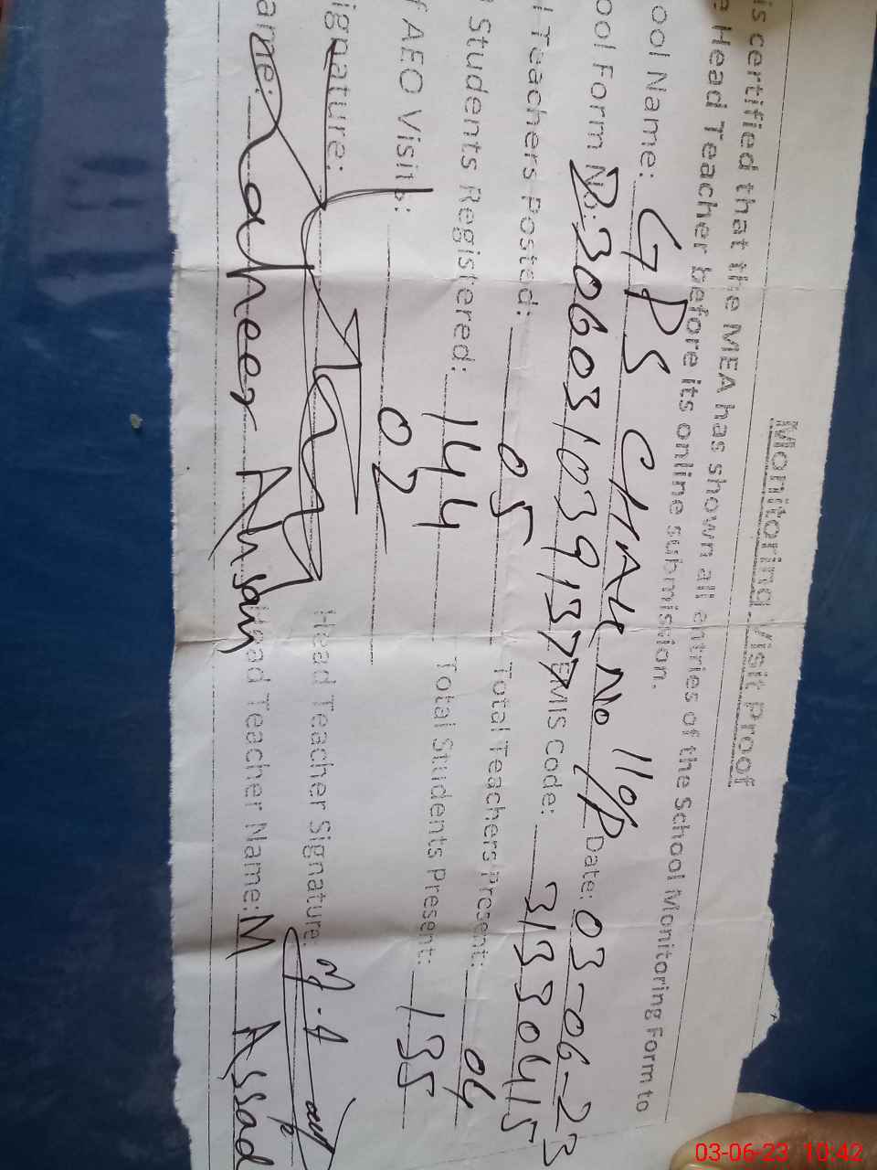 | Attendance Register | Head Teacher | MEA with School | Visit Proof |
