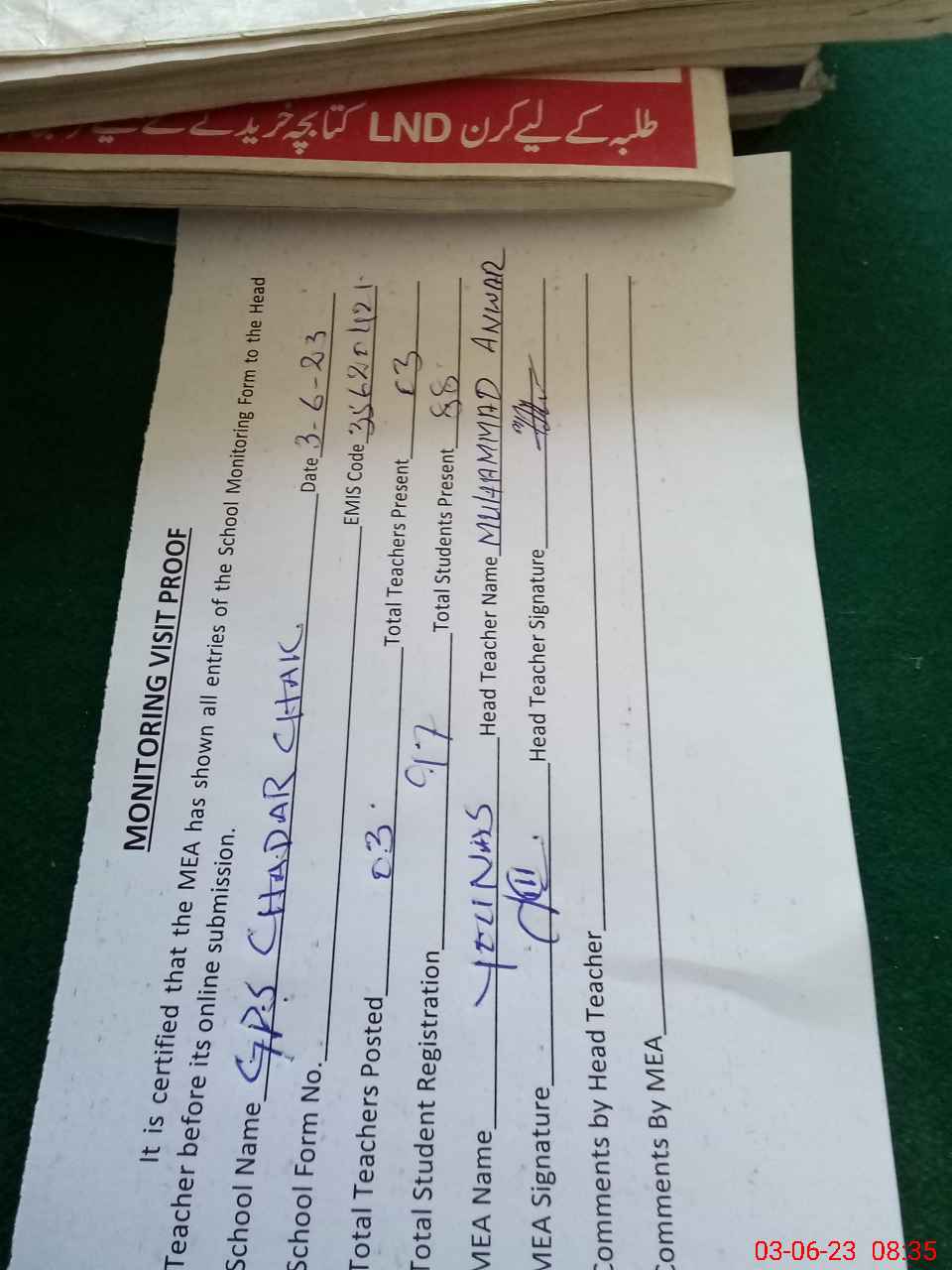 | Attendance Register | Head Teacher | MEA with School | Visit Proof |