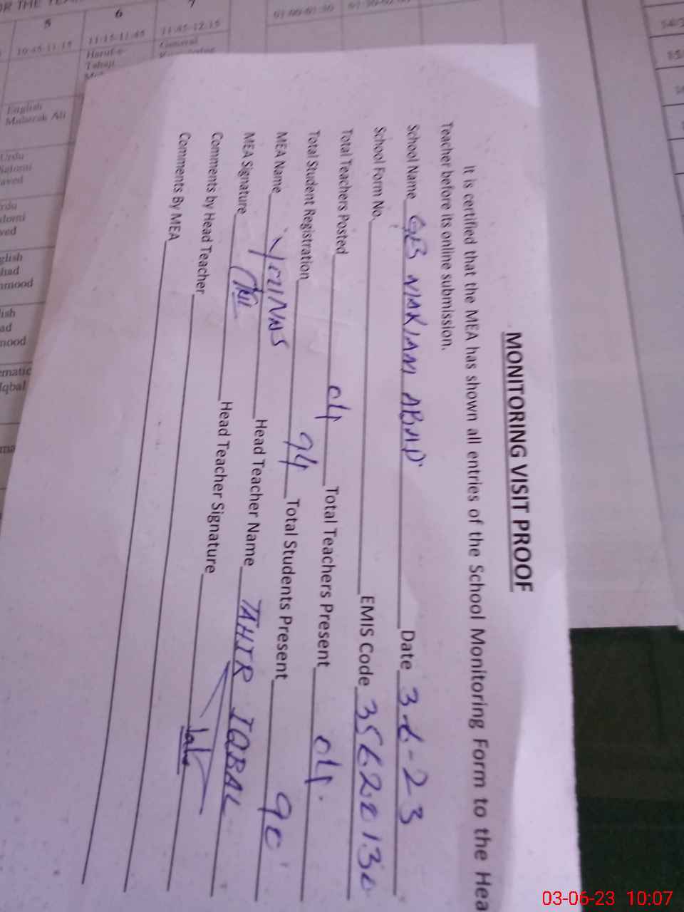 | Attendance Register | Head Teacher | MEA with School | Visit Proof |