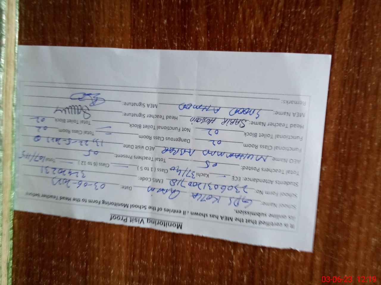 | Monitoring Date: 03-06-2023 | Start Time: 03-06-2023 12:00 PM | End Time: 03-06-2023 12:23 PM | Name of MEA: Sa**** Ah**** | |