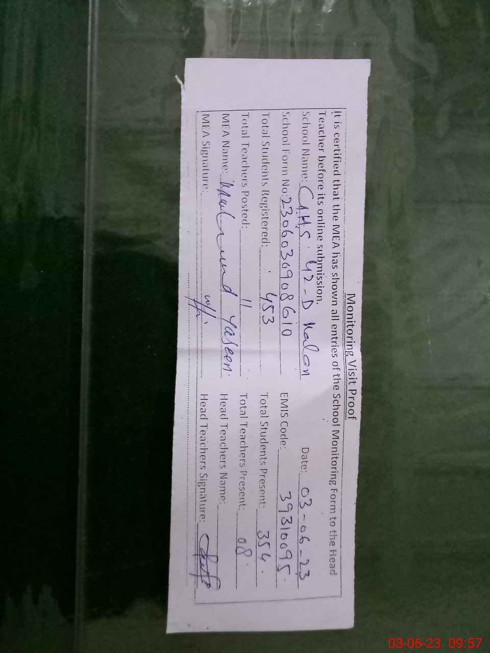 | Attendance Register | Head Teacher | MEA with School | Visit Proof |