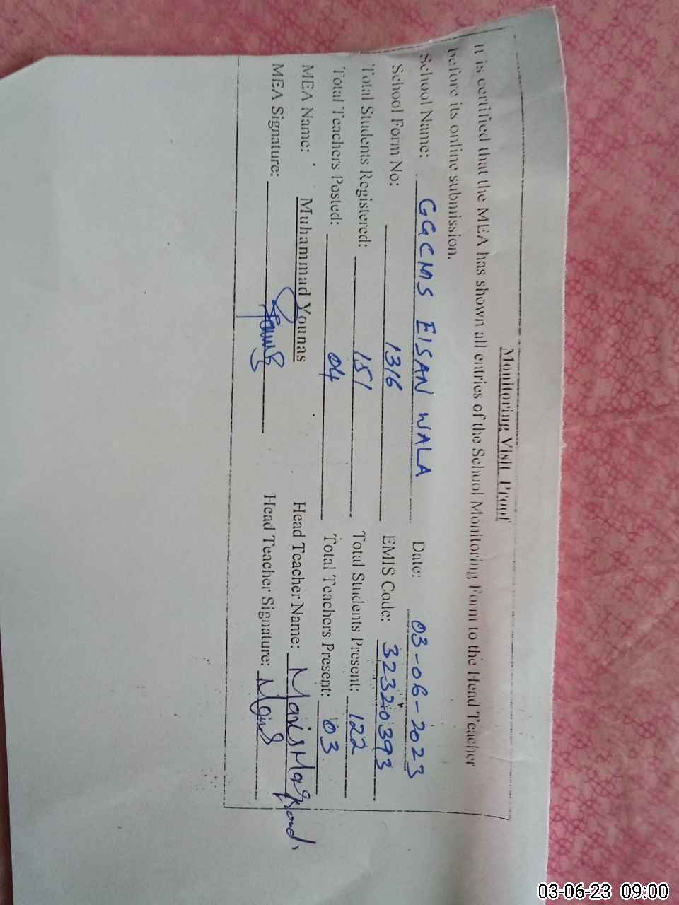 | EMIS Code: 32320393 | Name of School: GGCMS EISAN WALA | |||
